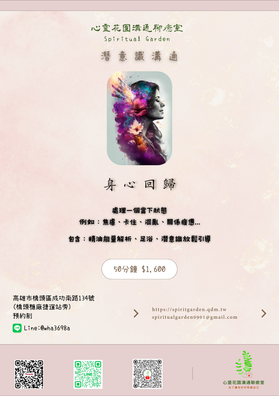 精油身心解析、足浴放鬆、NLP潛意識溝通引導、心輪按摩