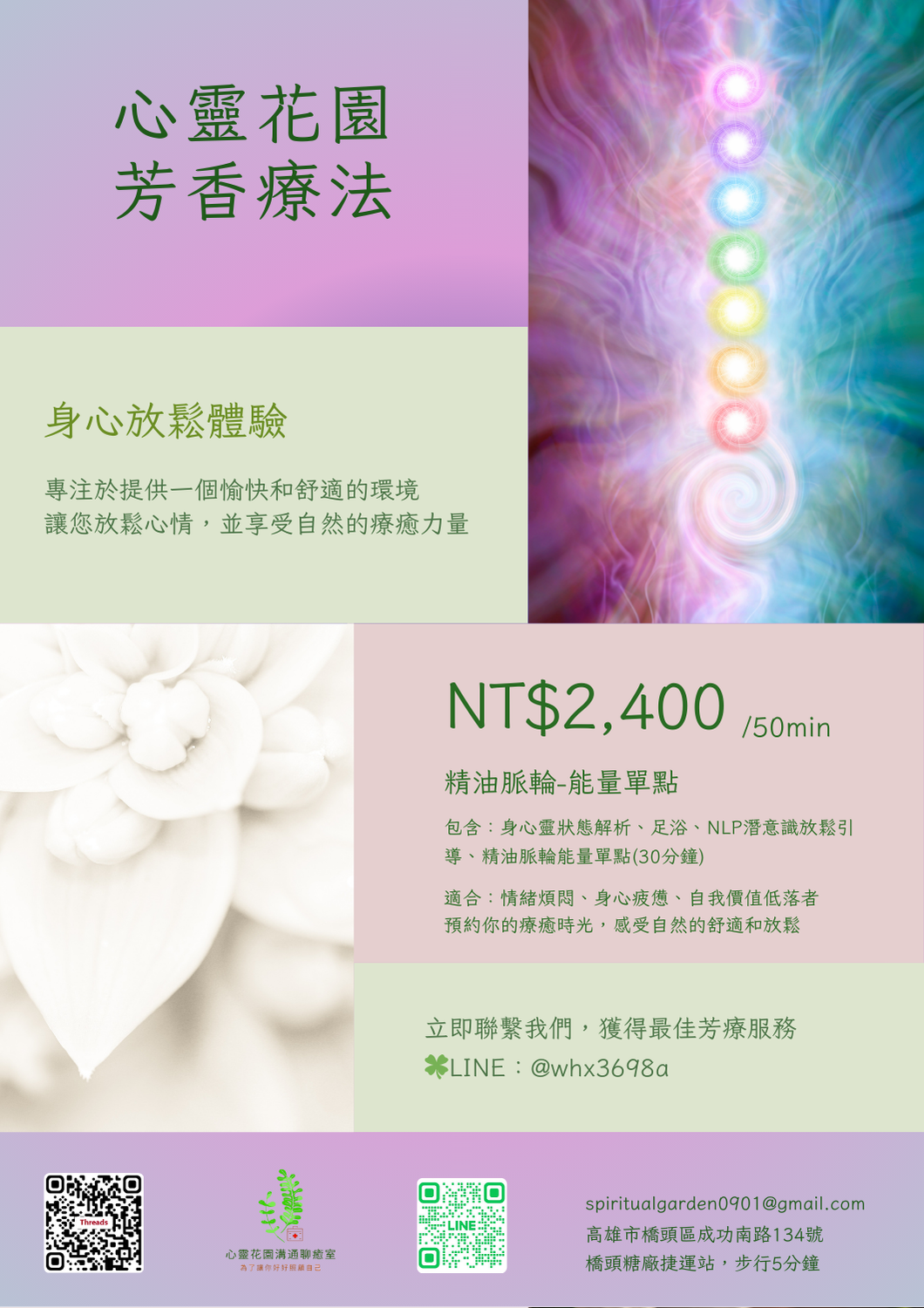 包含:身心靈狀態解析、足浴、潛意識放鬆引導、全身脈輪能量單點(30分鐘)